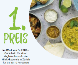 Kannst du die Quizfrage beim Gewinnspiel im „Öise Lade“-Magazin auf Seite 59 beantworten? Verlost werden ein Kochkurs an der Hiltl-Akademie für bis zu 10 Personen und Tibits-Gutscheine im Wert von CHF 100.- oder CHF 50.-.